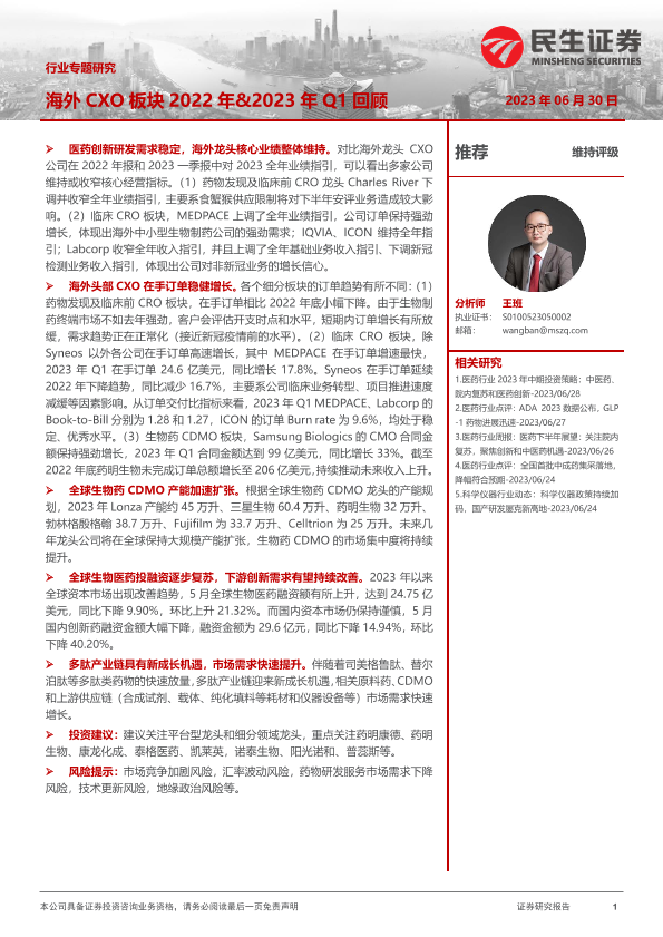【民生证券】【20230630】医药行业专题研究-海外CXO板块2022年&2023年Q1回顾-33页