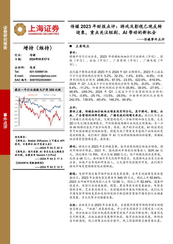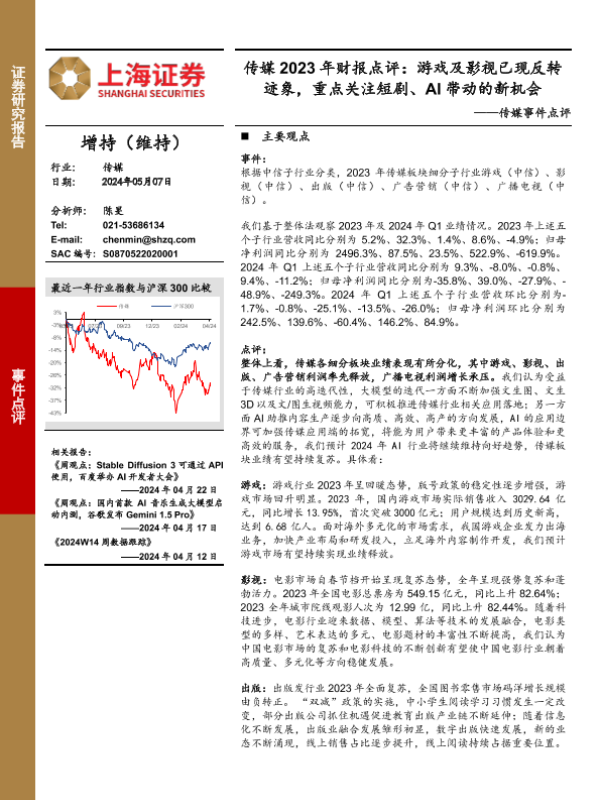 【上海证券】【20240507】传媒2023年财报点评:游戏及影视已现反转迹象,重点关注短剧、AI带动的新机会-3页
