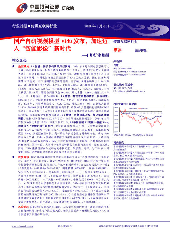 【银河证券】【20240506】【中国银河】4月行业月报:国产自研视频模型Vidu发布,加速迈入“智能影像”新时代-29页