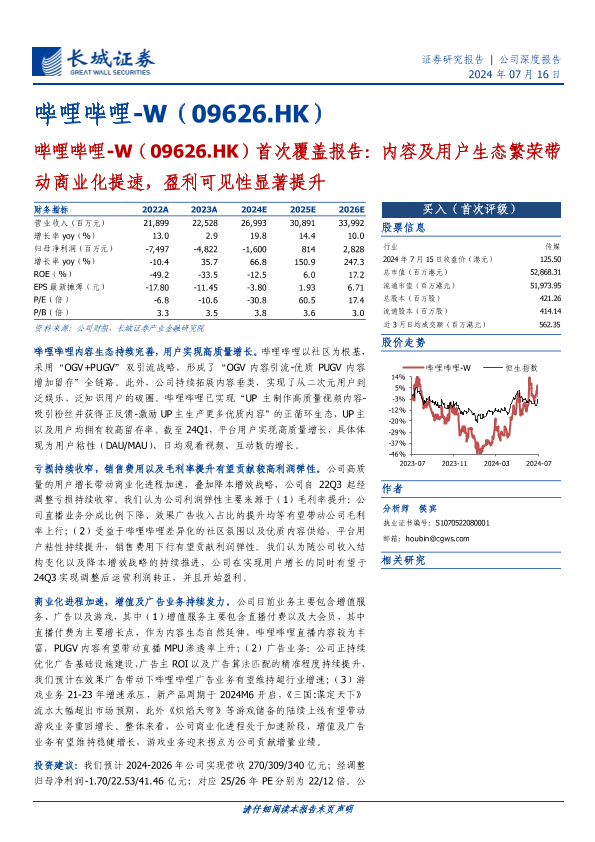 【长城证券】【20240716】哔哩哔哩-W(09626.HK)首次覆盖报告:内容及用户生态繁荣带动商业化提速,盈利可见性显著提升-51页