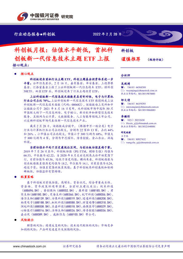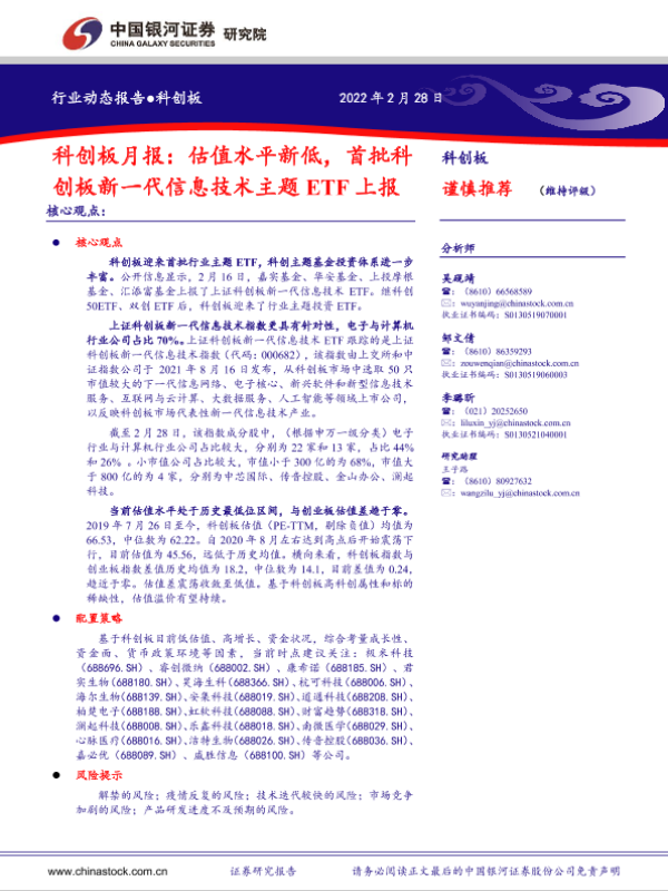 【银河证券】【20220228】科创板月报:估值水平新低,首批科创板新一代信息技术主题ETF上报-20页