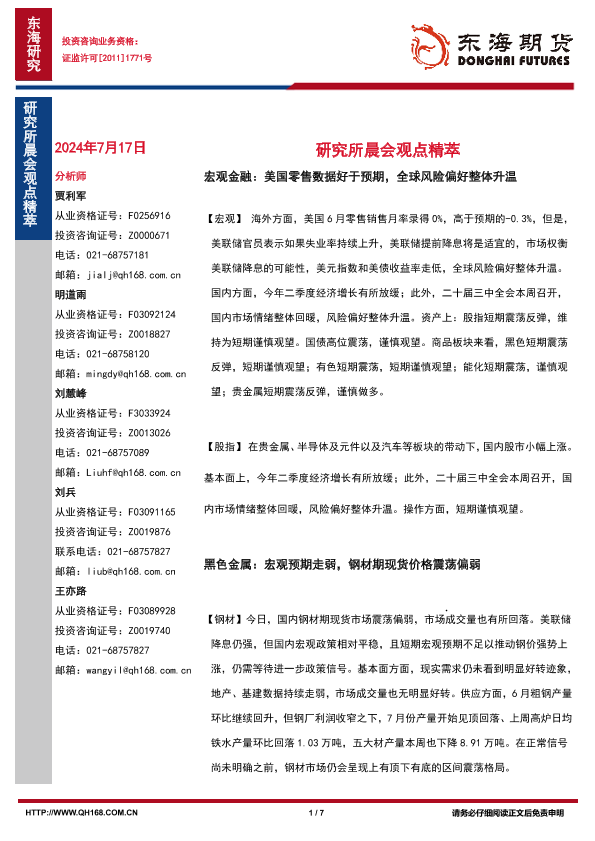 【东海期货】【20240717】研究所晨会观点精萃:美国零售数据好于预期,全球风险偏好整体升温-7页