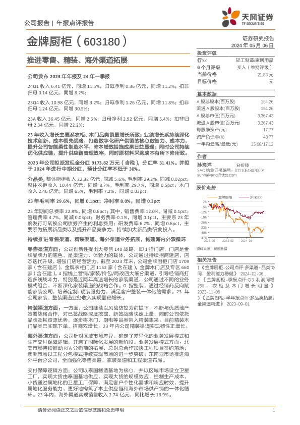 天风证券 海外渠道 精装渠道 金牌厨柜 零售渠道