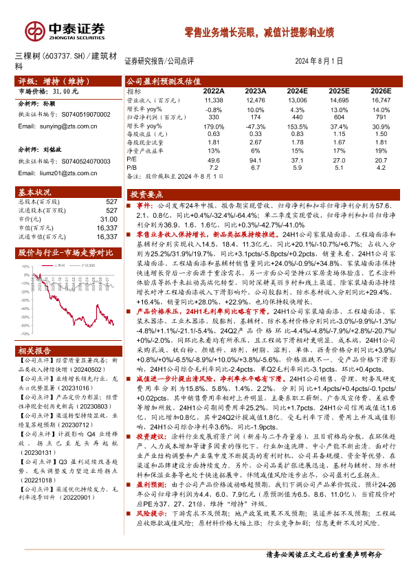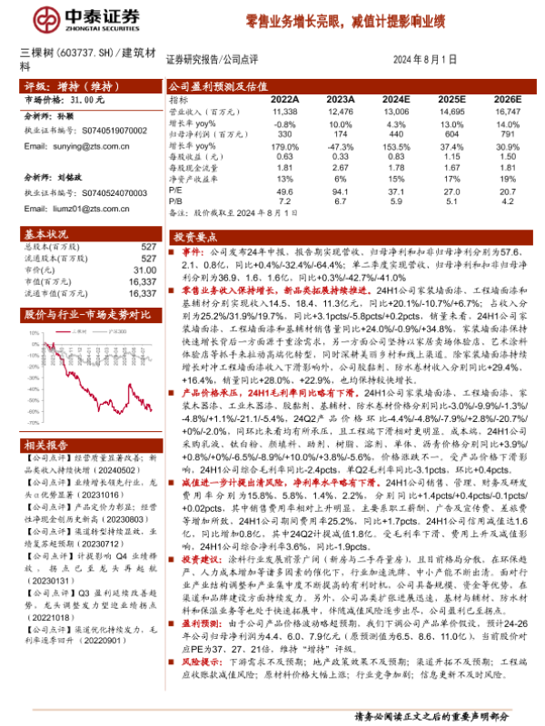 业绩分析 减值计提 建筑材料 涂料行业 零售业务