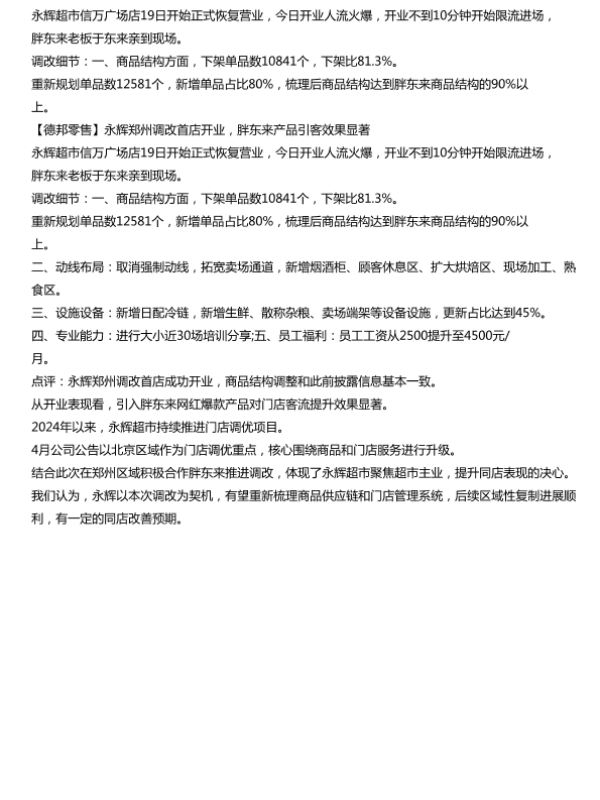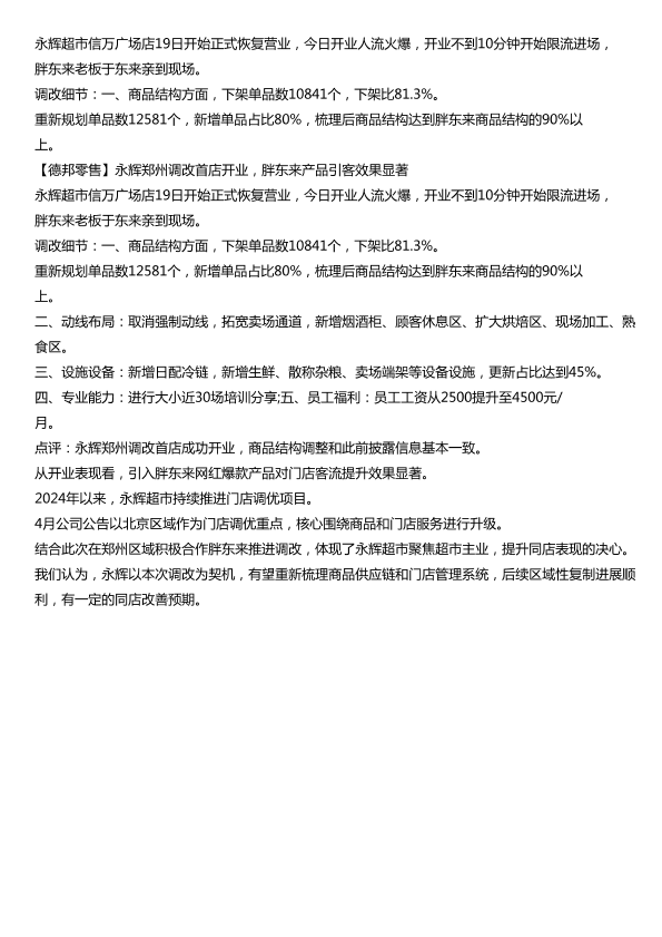 【德邦证券】【2024】德邦零售永辉郑州调改首店开业胖东来产品引客效果显著永辉超市-1页