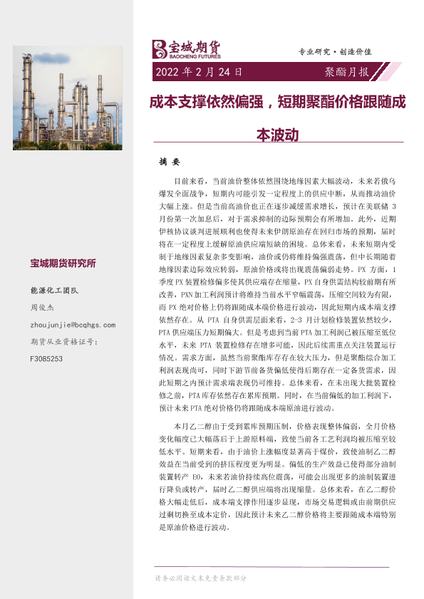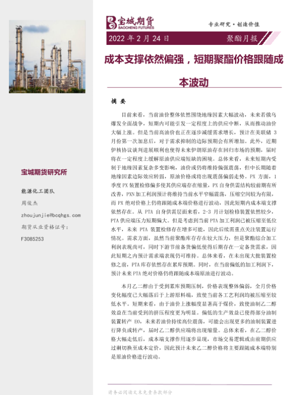 【宝城期货】【20220224】聚酯月报:成本支撑依然偏强,短期聚酯价格跟随成本波动-18页