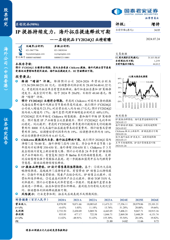 【国泰君安证券】【20240724】名创优品FY2024Q2业绩前瞻:IP提振持续发力,海外拓店提速释放可期-3页