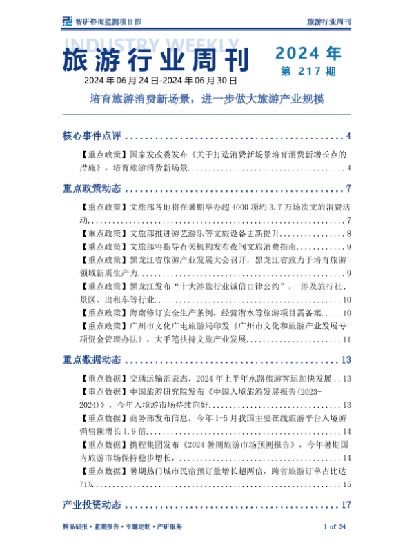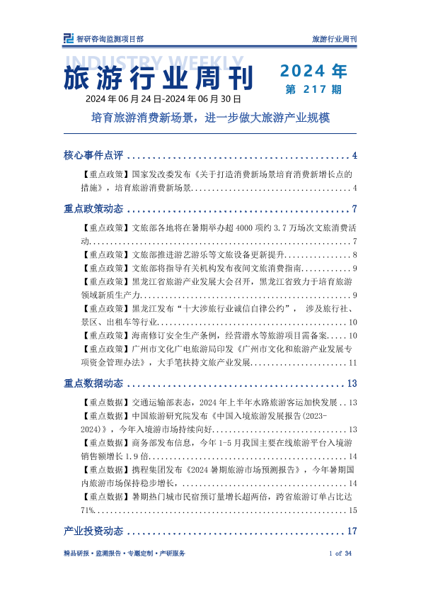 【智研咨询监测项目部】【202406】旅游行业周刊:培育旅游消费新场景,进一步做大旅游产业规模-34页