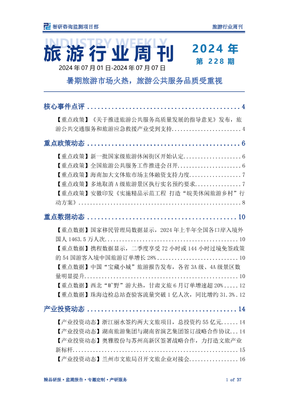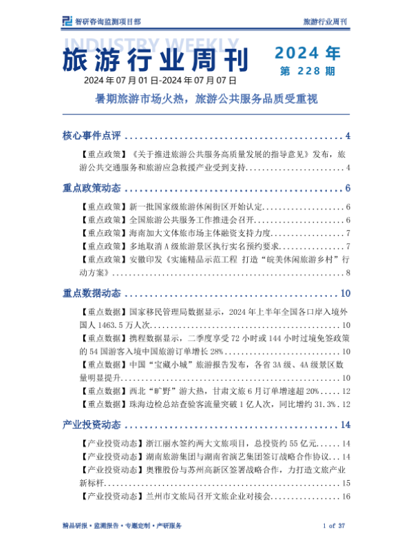 【智研咨询监测项目部】【202407】旅游行业周刊:暑期旅游市场火热,旅游公共服务品质受重视-37页