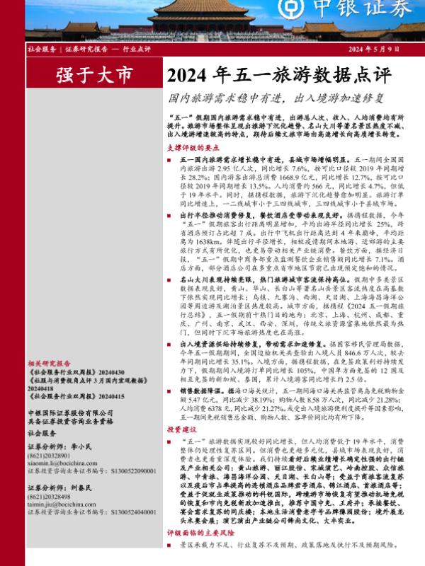【中银证券】【20240509】2024年五一旅游数据点评:国内旅游需求稳中有进,出入境游加速修复-6页