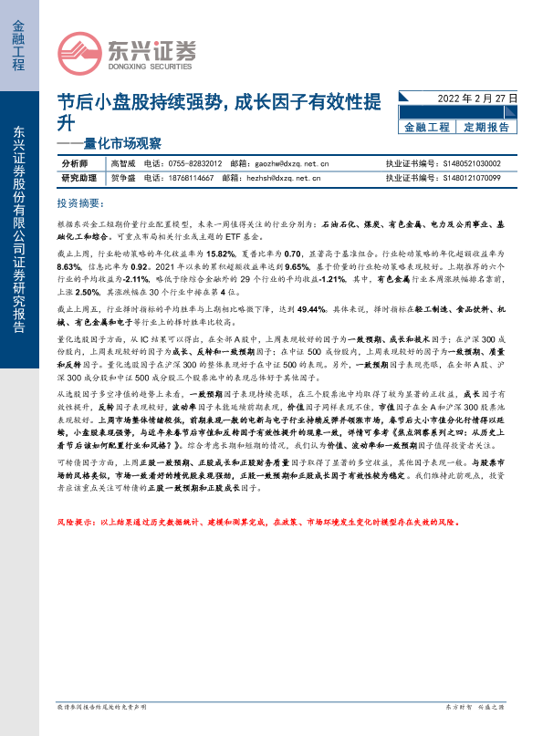 【东兴证券】【20220227】量化市场观察:节后小盘股持续强势,成长因子有效性提升-18页