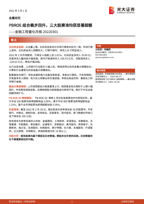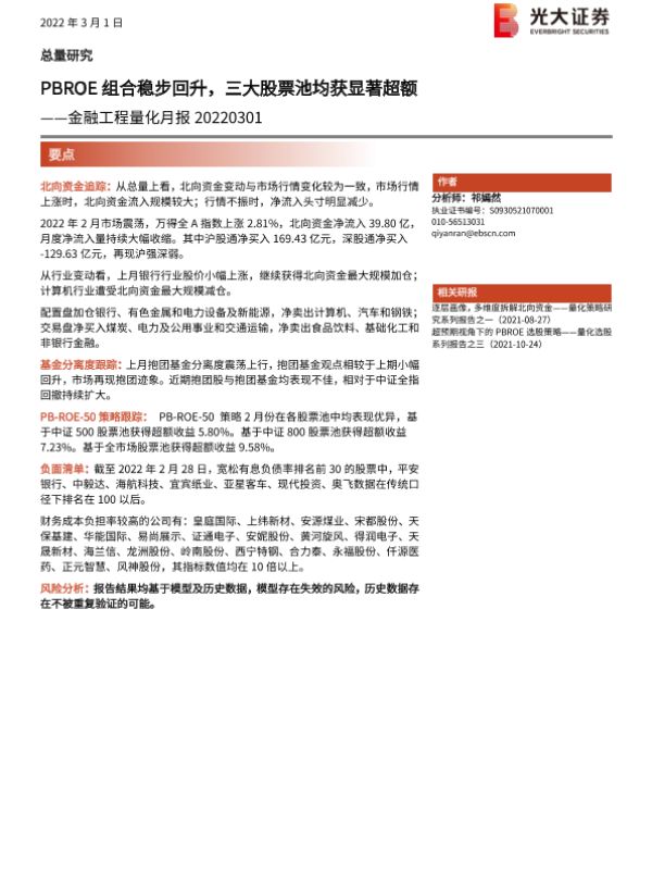 【光大证券】【20220301】金融工程量化月报:PBROE组合稳步回升,三大股票池均获显著超额-15页