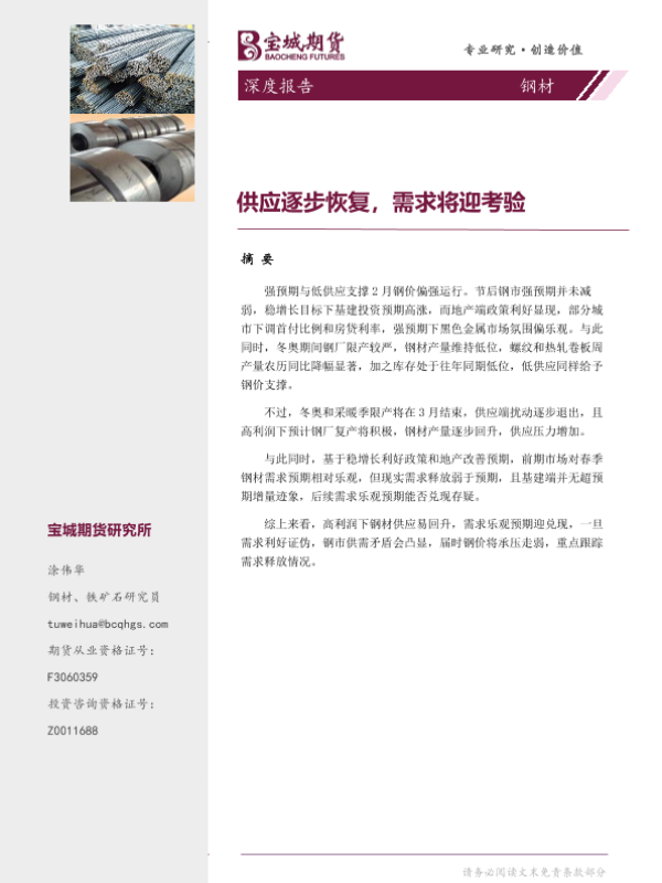 【宝城期货】【20220225】钢材深度报告:供应逐步恢复,需求将迎考验-15页