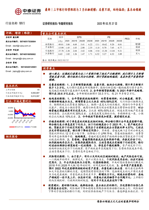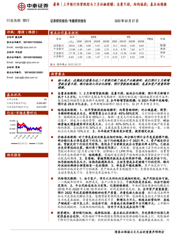 【中泰证券】【20220227】银行业最新上市银行经营跟踪与2月社融前瞻:总量不弱,结构偏弱;基本面稳健-17页