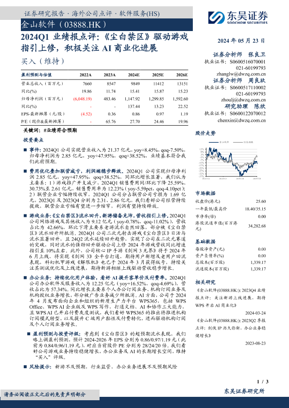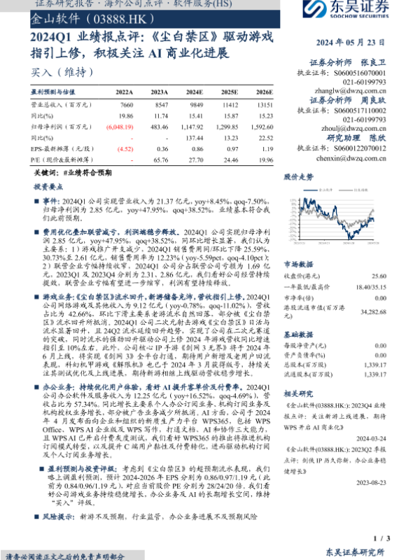 【东吴证券】【20240523】2024Q1业绩报点评:《尘白禁区》驱动游戏指引上修,积极关注AI商业化进展-3页