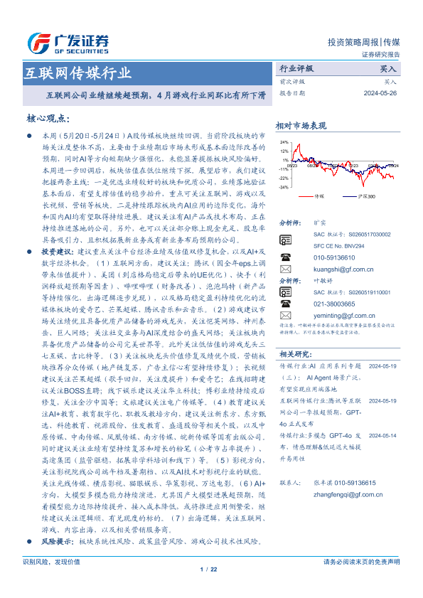 【广发证券】【20240526】互联网公司业绩继续超预期,4月游戏行业同环比有所下滑-22页