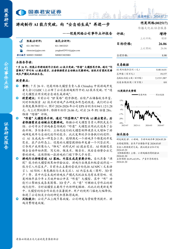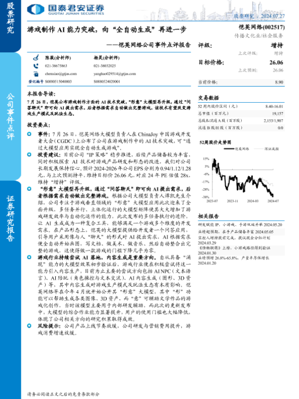 【国泰君安证券】【20240727】恺英网络公司事件点评报告:游戏制作AI能力突破,向“全自动生成”再进一步-2页