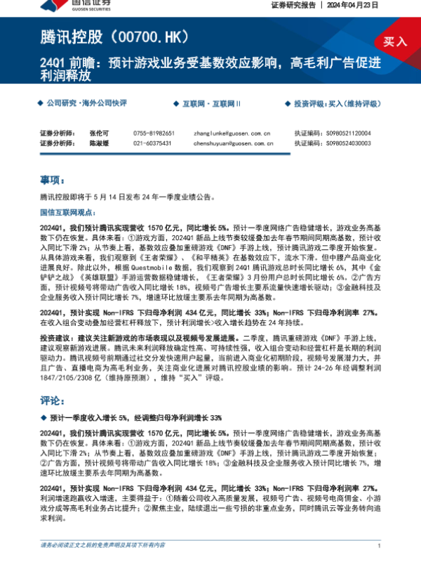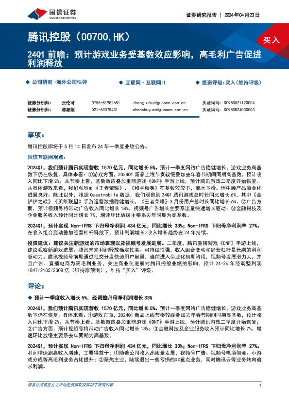 【国信证券】【20240423】24Q1前瞻:预计游戏业务受基数效应影响,高毛利广告促进利润释放-8页
