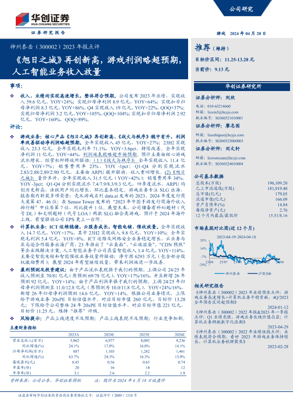 【华创证券】【202404】2023年报点评:《旭日之城》再创新高,游戏利润略超预期,人工智能业务收入放量-6页