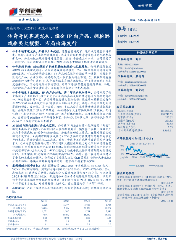 【华创证券】【20240418】【华创证券】深度研究报告:传奇奇迹赛道龙头,掘金IP向产品、拥抱游戏垂类大模型、布局出海发行-24页
