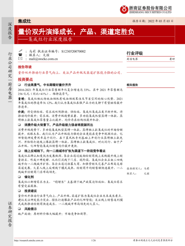 【浙商证券】【20220303】集成灶行业深度报告:量价双升演绎成长,产品、渠道定胜负-26页