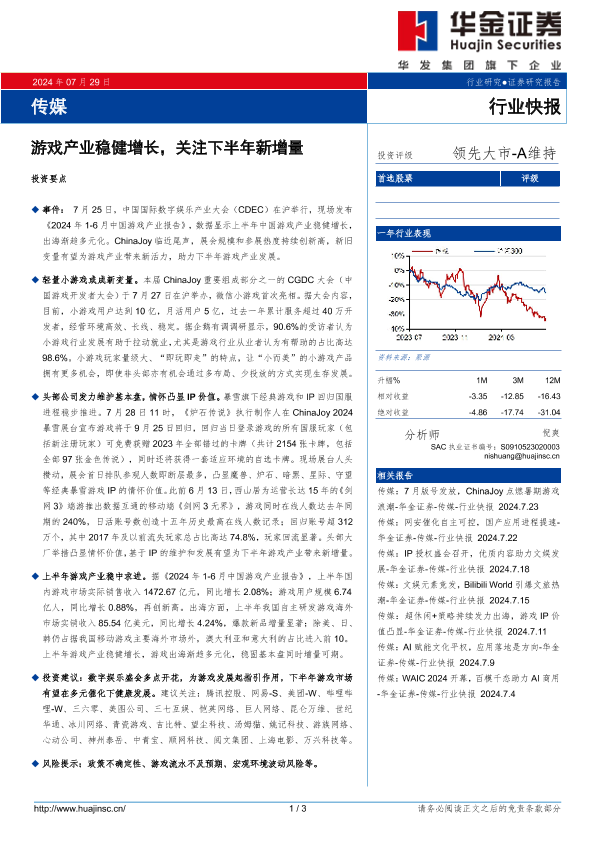 【华金证券】【20240729】游戏产业稳健增长,关注下半年新增量-3页