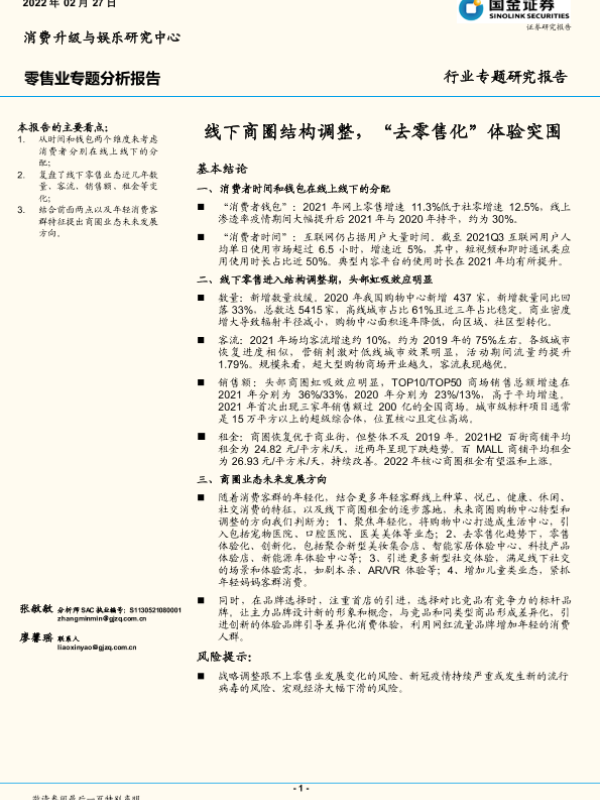 【国金证券】【20220227】零售行业专题分析报告:线下商圈结构调整,“去零售化”体验突围-18页
