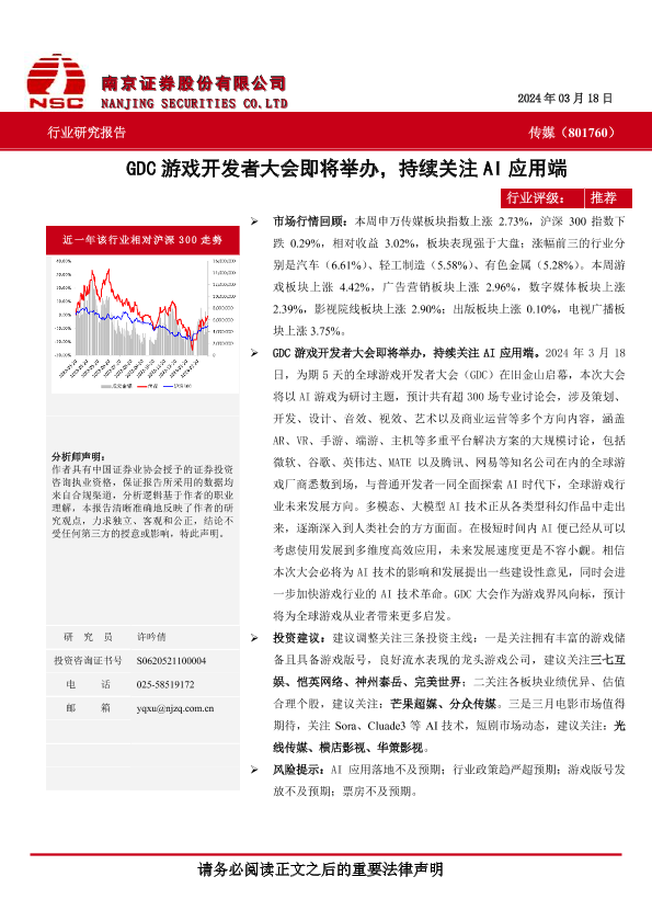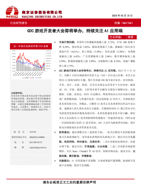 AI应用 传媒行业 南京证券 游戏开发者大会 GDC