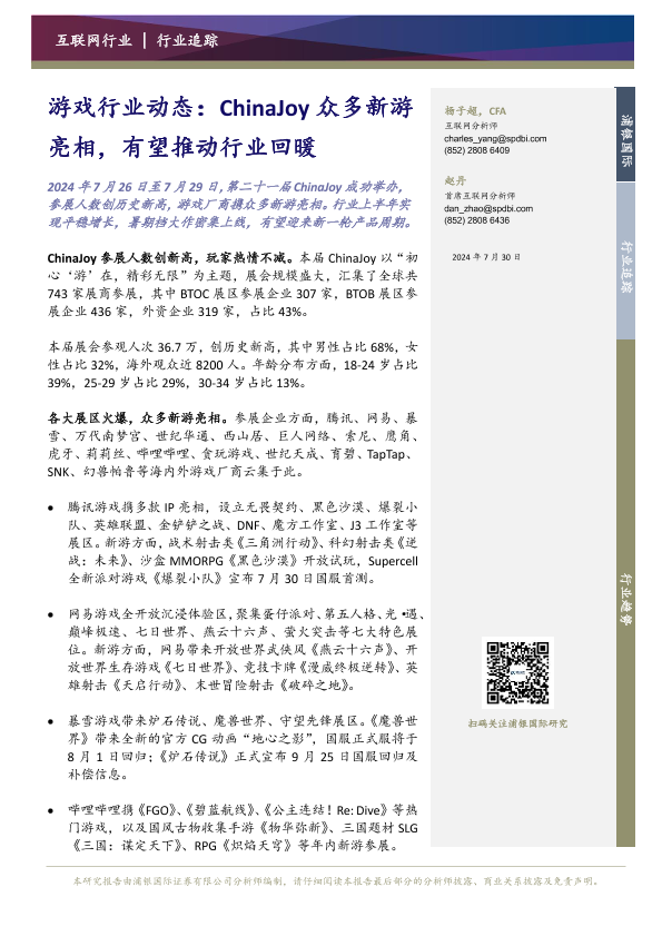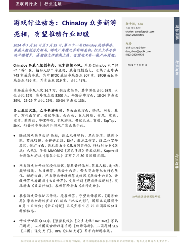 【浦银国际】【20240730】游戏行业动态:ChinaJoy众多新游亮相,有望推动行业回暖-7页