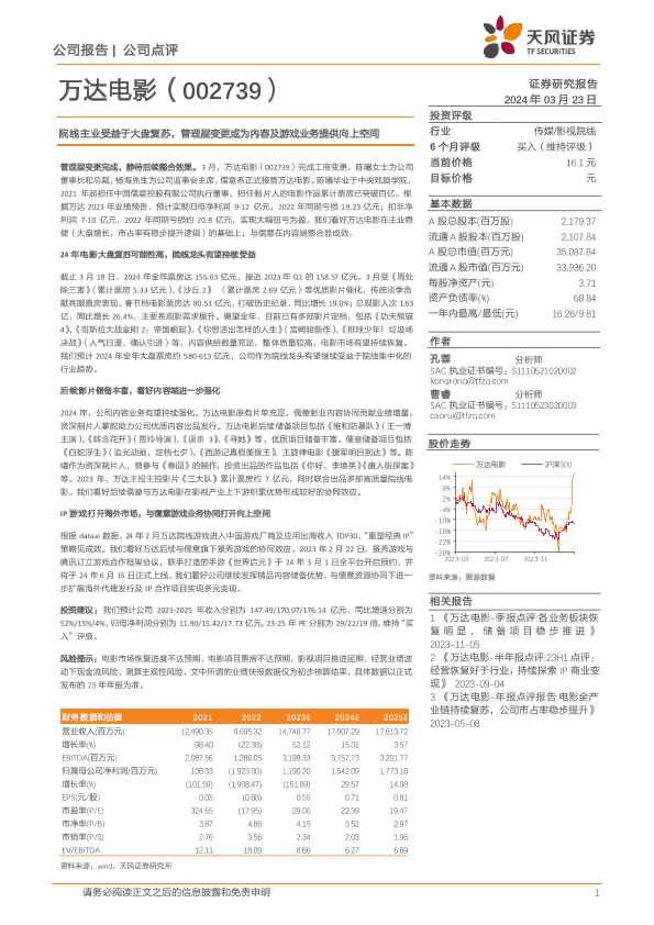 【天风证券】【20240323】院线主业受益于大盘复苏,管理层变更或为内容及游戏业务提供向上空间-8页