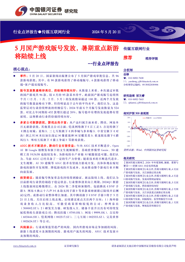 AIGC技术 传媒互联网 游戏开发 行业点评 游戏版号