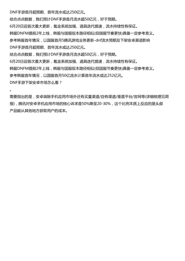 DNF手游 下架影响 安卓渠道 流水预期 腾讯游戏