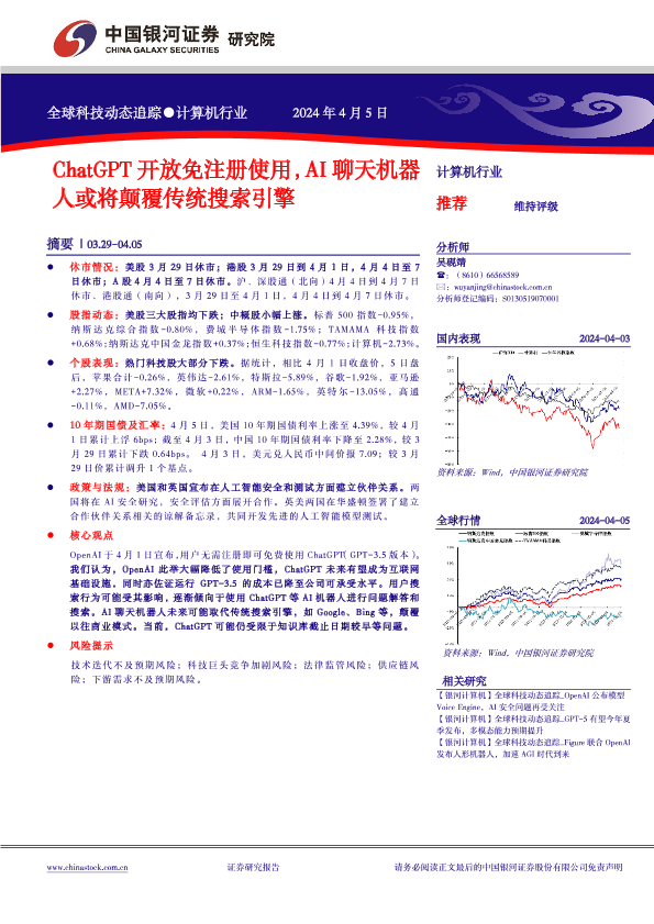 【银河证券】【20240405】ChatGPT开放免注册使用,AI聊天机器人或将颠覆传统搜索引擎-10页