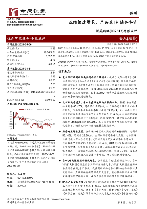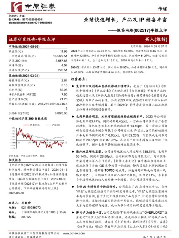 【中原证券】【20240507】【中原证券】年报点评:业绩快速增长,产品及IP储备丰富-5页