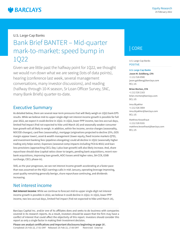 【Barclays Capital Inc.】【20220225】U.S. Large-Cap Banks - Bank Brief BANTER – Mid-quarter mark-to-market speed bump in 1Q22-21页