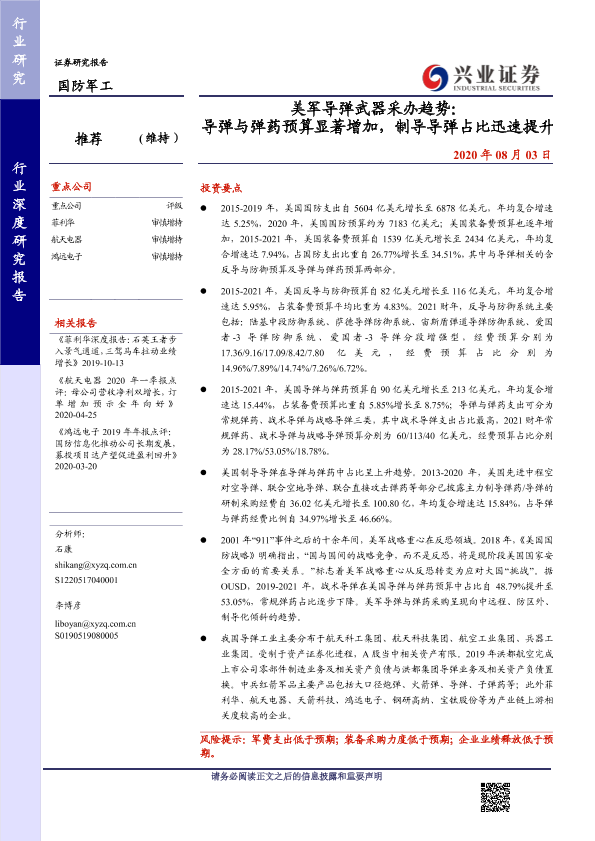 【兴业证券】【20200803】2020.08.03-美军导弹武器采办趋势:导弹与弹药预算显著增加,制导导弹占比迅速提升-28页