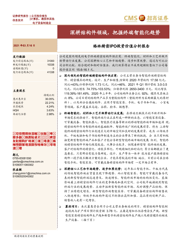 IPO 智能终端 格林精密 精密结构件 行业分析