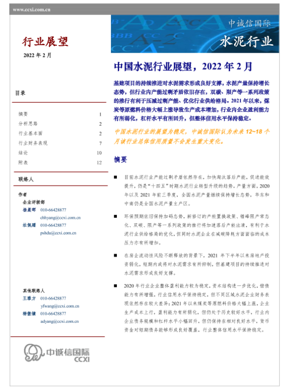 【中诚信国际】【202202】中国水泥行业展望-14页