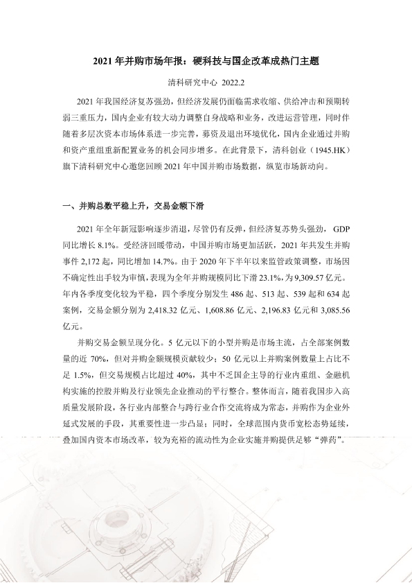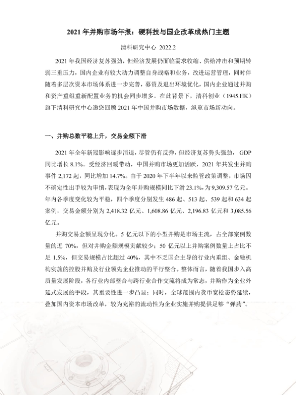 【清科研究中心】【202202】2021年并购市场年报:硬科技与国企改革成热门主题-7页