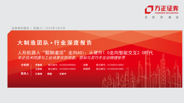 【方正证券】【20250309】人形机器人‘醍醐灌顶’走向AGI:从硬车企技术同源与工业场景优势明显,感知与灵巧手互动物理世界-61页
