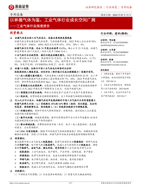 【浙商证券】【202307】浙商证券:工业气体行业深度报告-以林德气体为鉴-工业气体行业成长空间广阔-27页