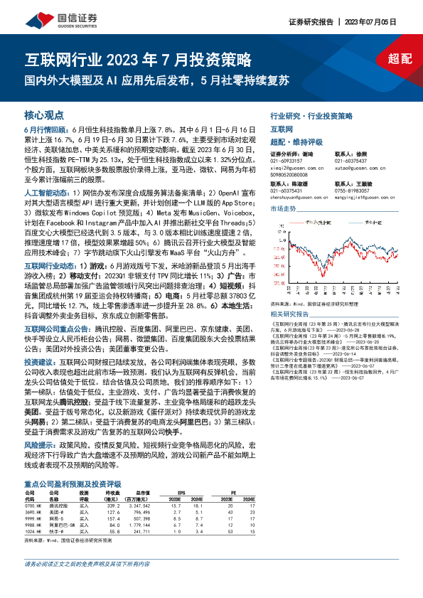 【国信证券】【20230705】互联网行业2023年7月投资策略:国内外大模型及AI应用先后发布,5月社零持续复苏-24页
