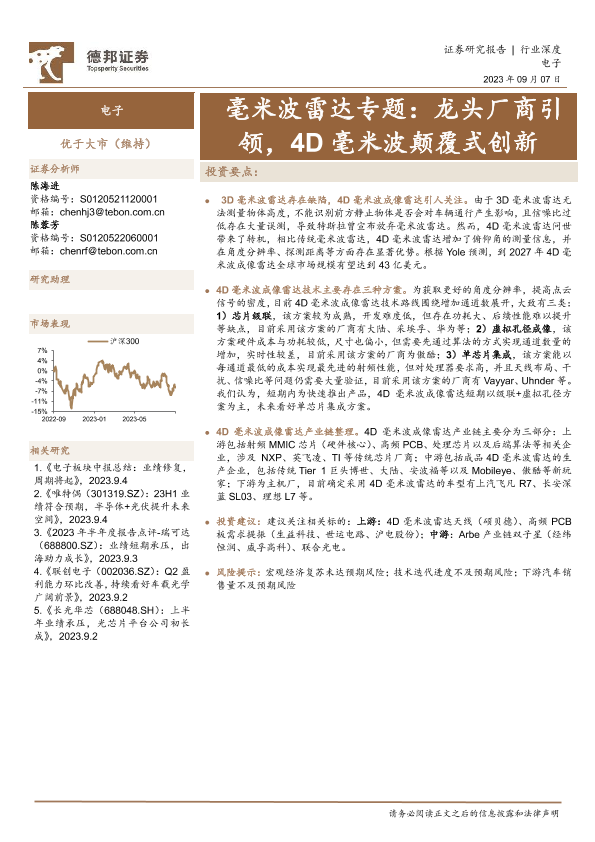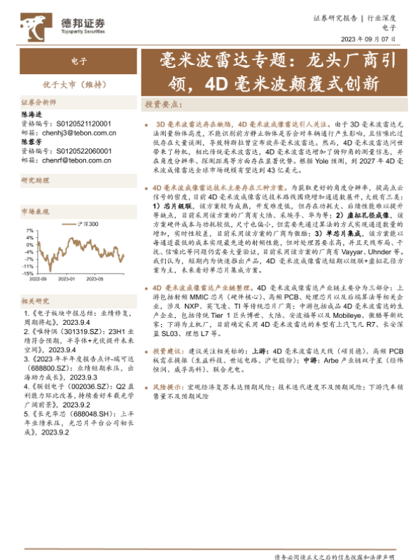 【德邦证券】【20230907】德邦证券:电子行业深度-毫米波雷达专题-龙头厂商引领-4D毫米波颠覆式创新-19页
