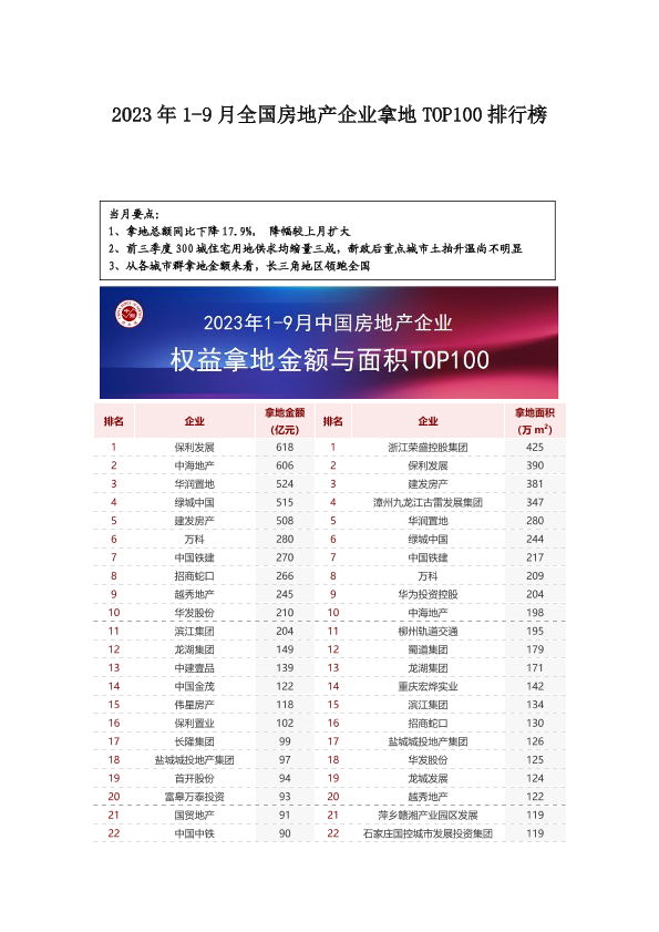 【CREIS中指数据】【2023】2023年1-9月全国房地产企业拿地TOP100排行榜-12页