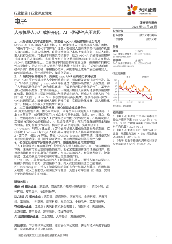 【天风证券】【20240131】电子行业:人形机器人元年或将开启,AI下游硬件应用迭起-63页
