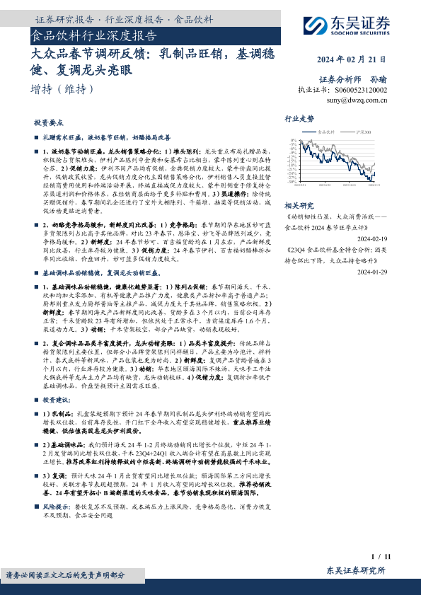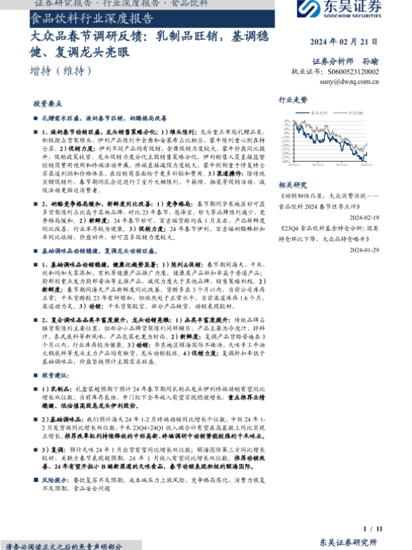 【东吴证券】【20240221】东吴证券:食品饮料行业深度报告-大众品春节调研反馈-乳制品旺销-基调稳健、复调龙头亮眼-11页