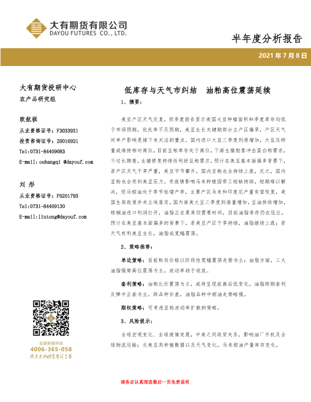 【大有期货】【20210708】油脂油料产业链半年度分析报告:低库存与天气市纠结,油粕高位震荡延续-17页
