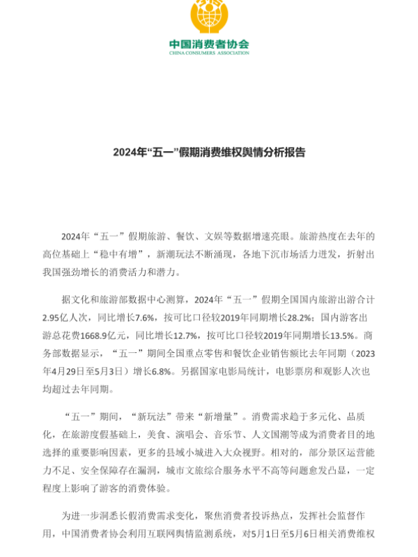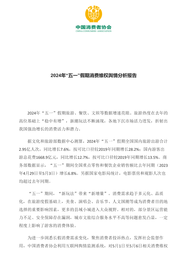 【中国消费者协会】【20240524】2024年“五一”假期消费维权舆情分析报告-10页