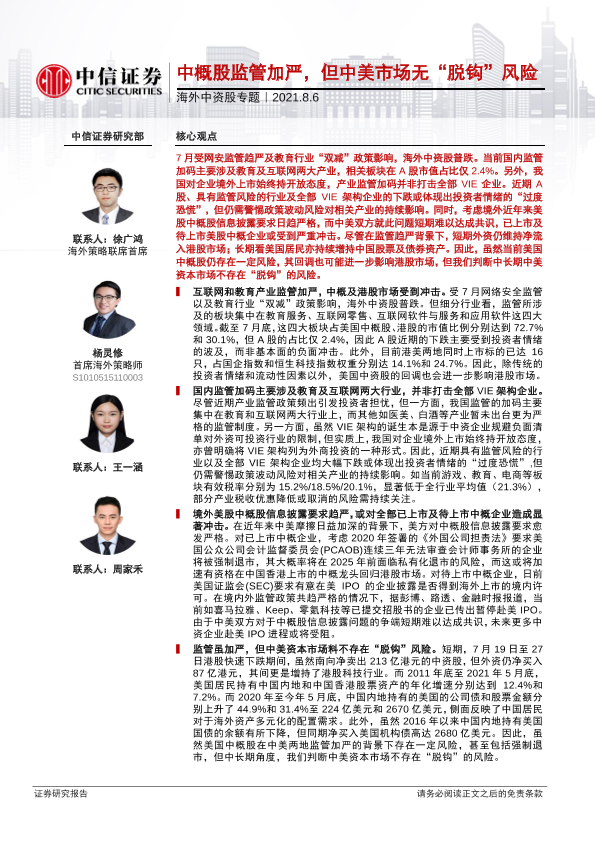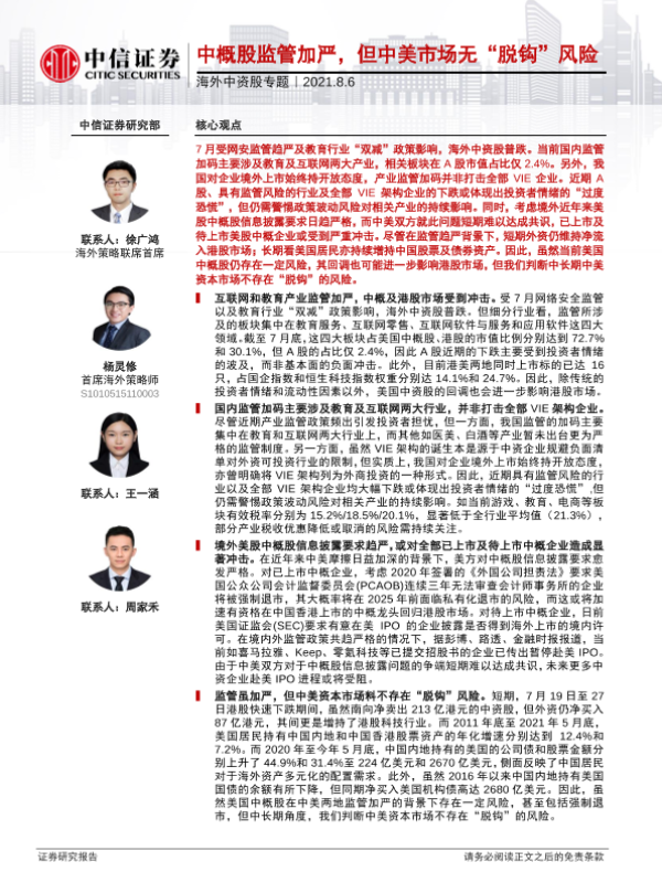 【中信证券】【20210806】海外中资股专题:中概股监管加严,但中美市场无“脱钩”风险-16页