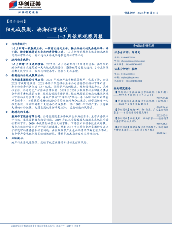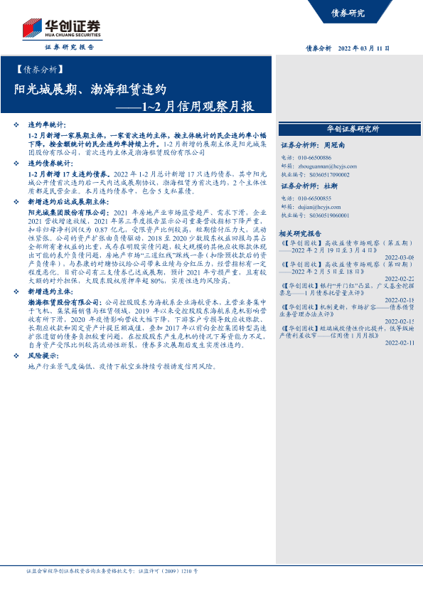 【华创证券】【20220311】1-2月信用观察月报:阳光城展期、渤海租赁违约-22页